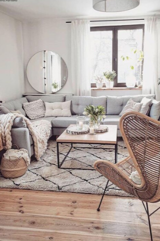 Es gibt nichts Besseres, als den Raum mit gemütlichen Elementen wie einem Teppich, Pelz, Plaids oder Kerzen aufzuwerten.